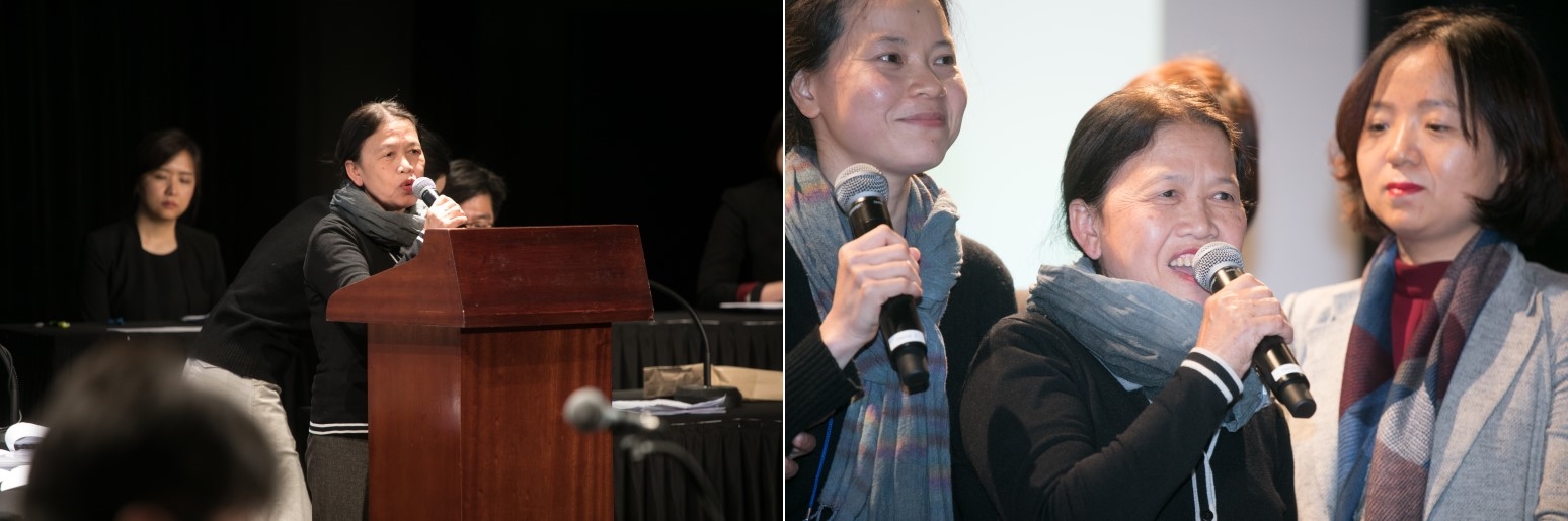 2번 사진: 시민평화법정에서 소견 발표를 하고 있는 응우옌티탄(좌) / 3번 사진: 법정에서 승소 판결 이후 기뻐하며 발언하고 있는 모습(우)