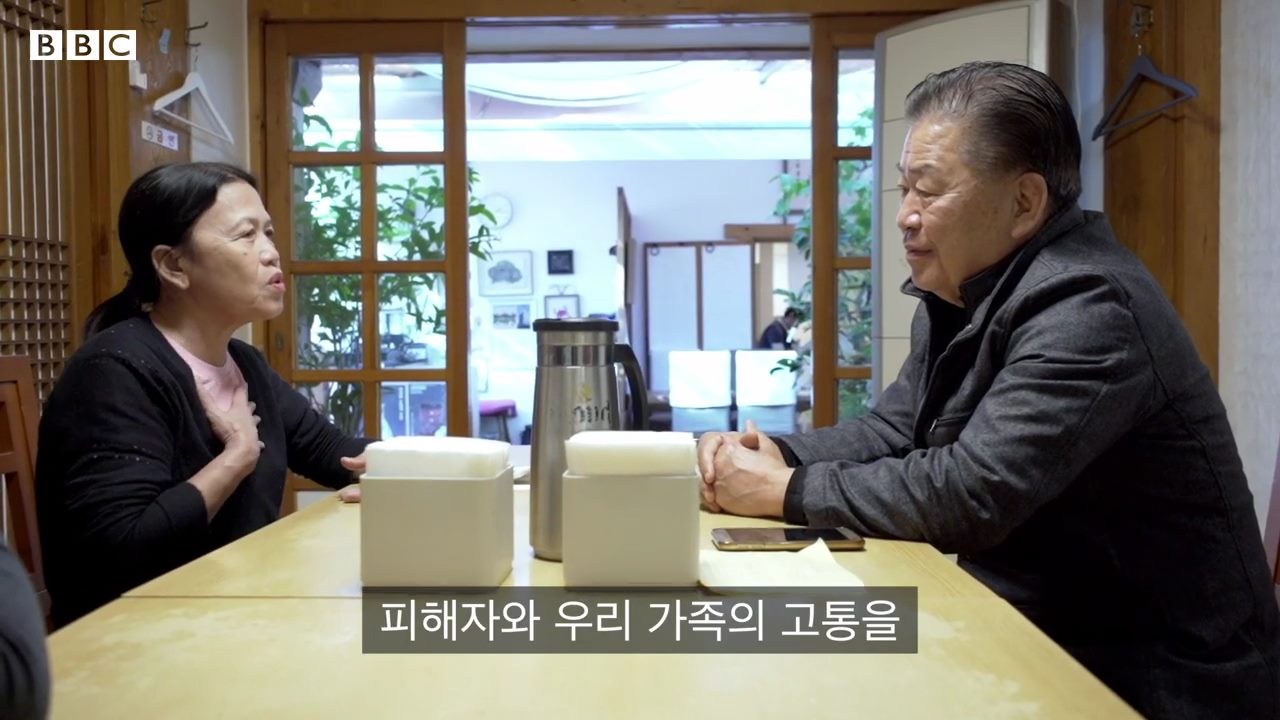 [탄]: 2019년 11월 BBC 초청으로 한국에 그 참전군인을 만나러 갔는데 당시 BBC가 저를 정말 많이 인터뷰했고 그 참전군인을 만나게 해주었습니다. 그가 내 손을 잡고 베트남 사람들에게 정말로 미안하다는 이야기를 했어요. 제가 보기에 지나간 과거의 일임에도 그는 양심의 가책을 느끼고 있었고, 저에게도 진심 어린 이야기를 간절하게 말하여 저의 고통도 조금은 누그러질 수가 있었습니다. 그의 이야기 중에 가장 인상 깊었던 이야기가 있어요. 전쟁 당시 그는 하미 마을에는 오지 않고 호이안, 퐁니 마을을 갔었는데, 당시 전장이 표현할 수 없을 정도로 잔혹하다고 했었고, 그가 퐁니 마을에서 도로변에 나열되어 있는 시신들과 마주했을 때 누군가 자신을 끌어 잡아당기는 듯 한 느낌을 받았다고 했었습니다. 저에게는 그가 심적으로 트라우마를 갖고 있다고 느꼈고 그날 이야기 중 가장 인상적이었습니다.