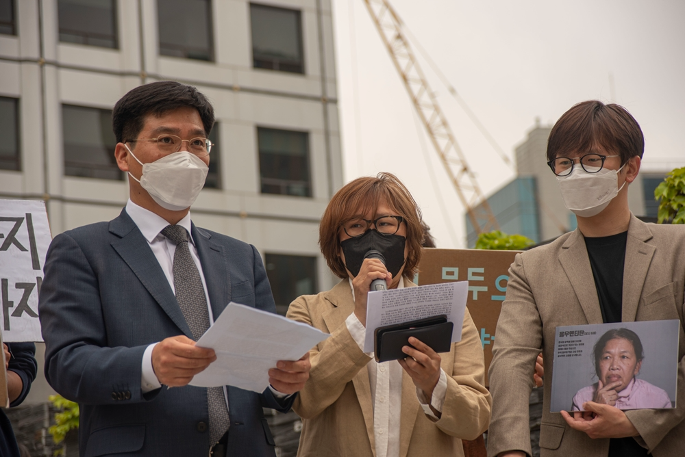 진상규명신청 대리인 김남주 변호사(좌)와 심아정 독립연구활동가(가운데)의 기자회견문 낭독