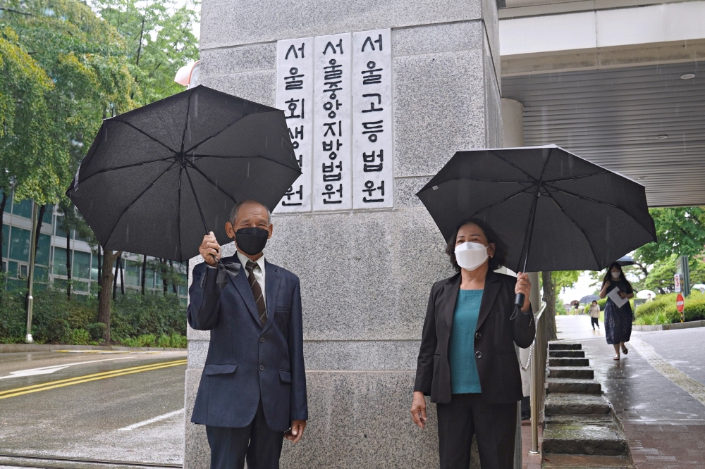 서울중앙지방법원 건물 1층에서 응우옌득쩌이(좌)와 응우옌티탄(우)