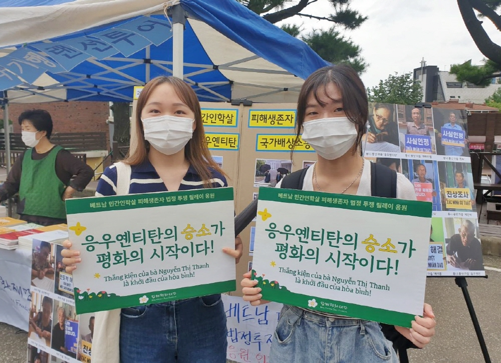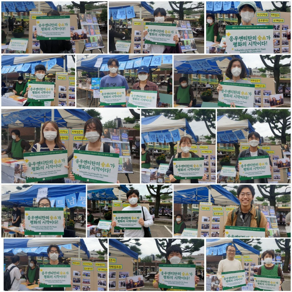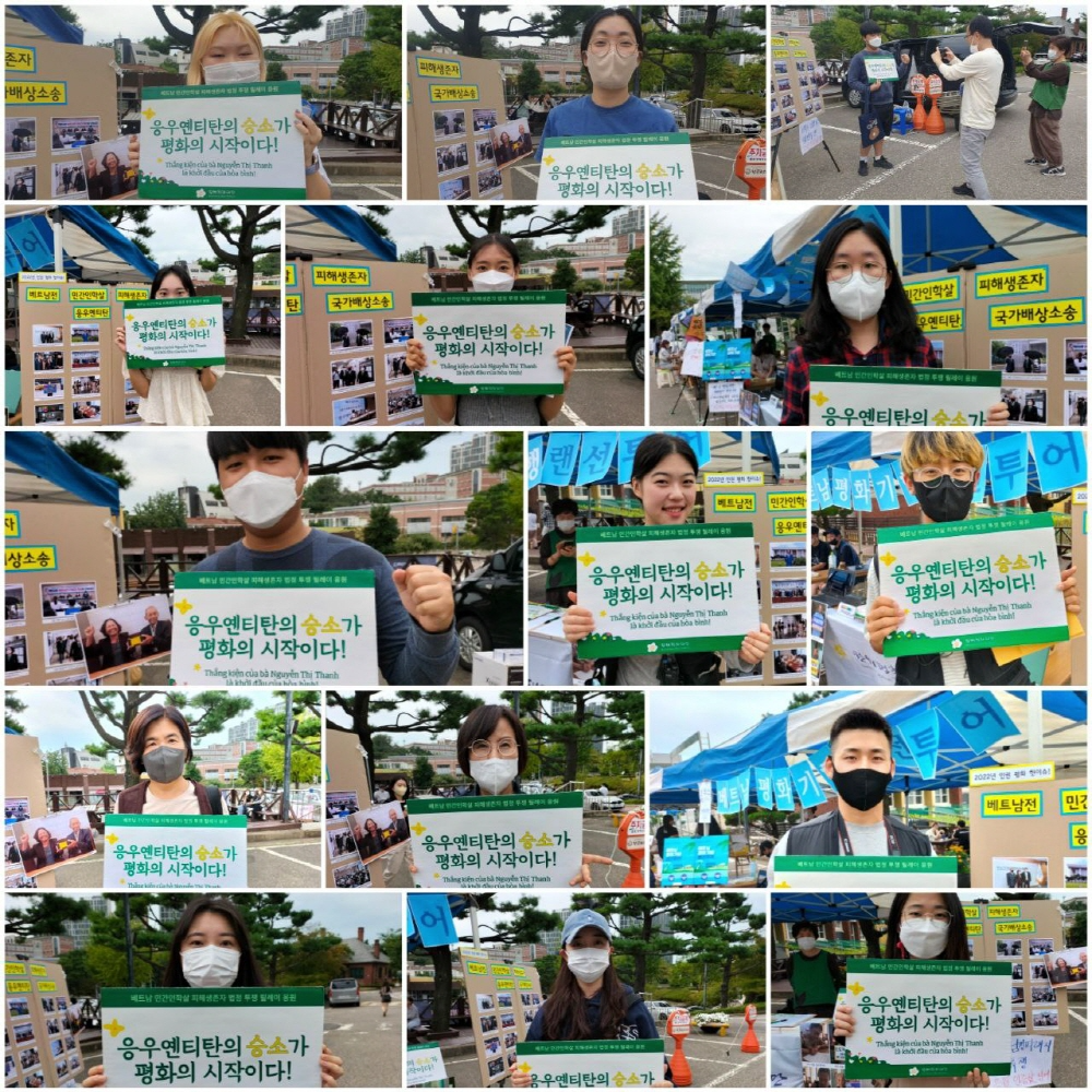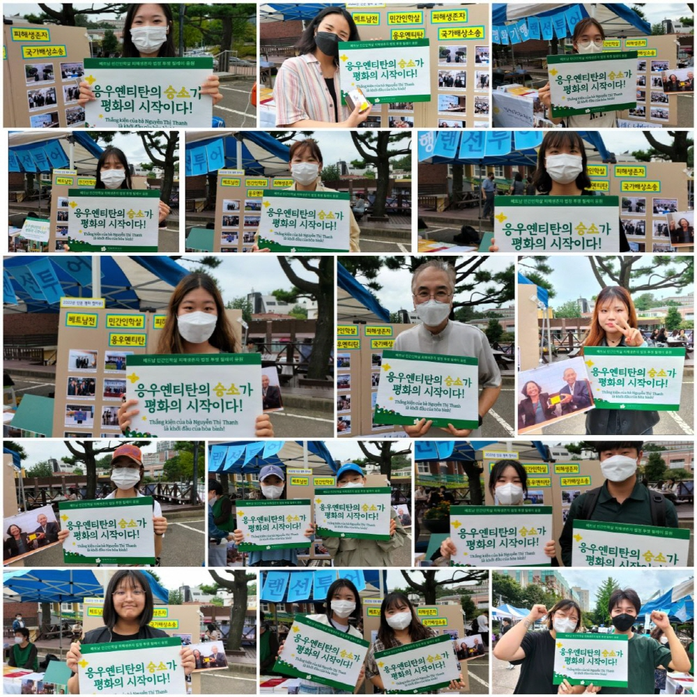 이번 부스 활동의 포인트는 응우옌티탄 법정 투쟁 홍보! 지난 8월, 한국 언론을 뜨겁게 달군 베트남전 민간인학살 피해생존자 응우옌티탄의 국가배상소송 이슈를 알리며 그분의 법정 투쟁을 응원하는 인증샷 릴레이를 진행했고 60여 명의 성공회대 학생 분들이 참여해주셨습니다.