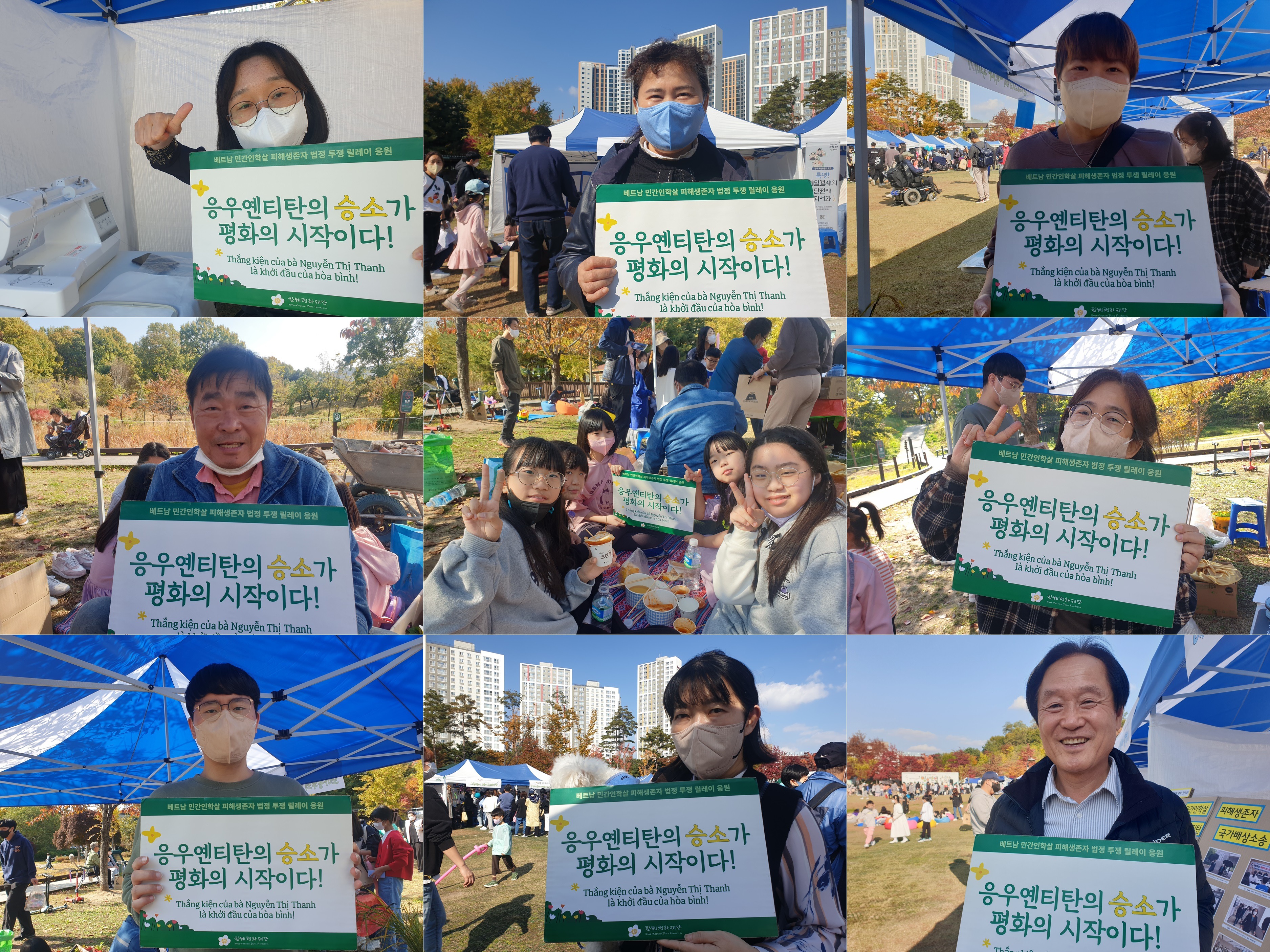 앞으로 다양한 시공간에서 시민들과 만나 베트남전쟁과 평화의 이야기를 나눌 수 있는 활동과 프로그램을 한베평화재단이 이어갈 수 있도록 노력하겠습니다. 이날 인증샷에 참여해주신 분들, 후원금과 함께 응원의 마음을 전해주신 시민 분들 모두에게 감사의 인사를 전합니다!