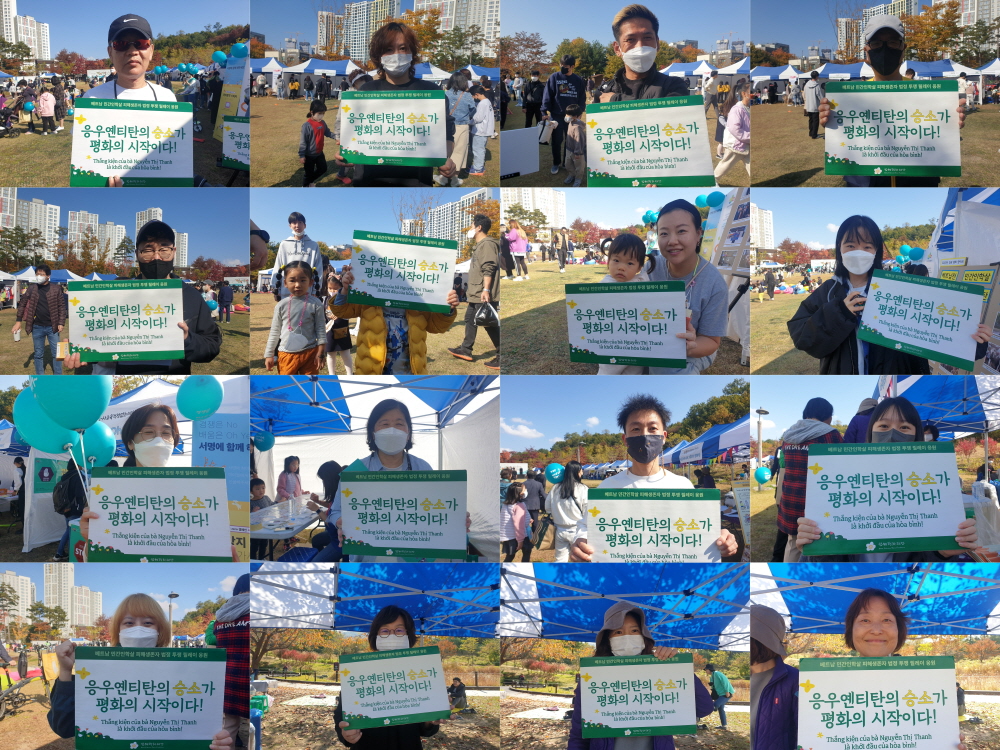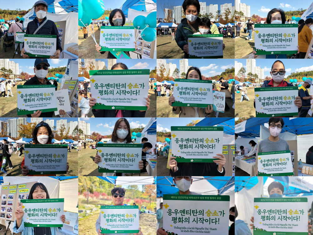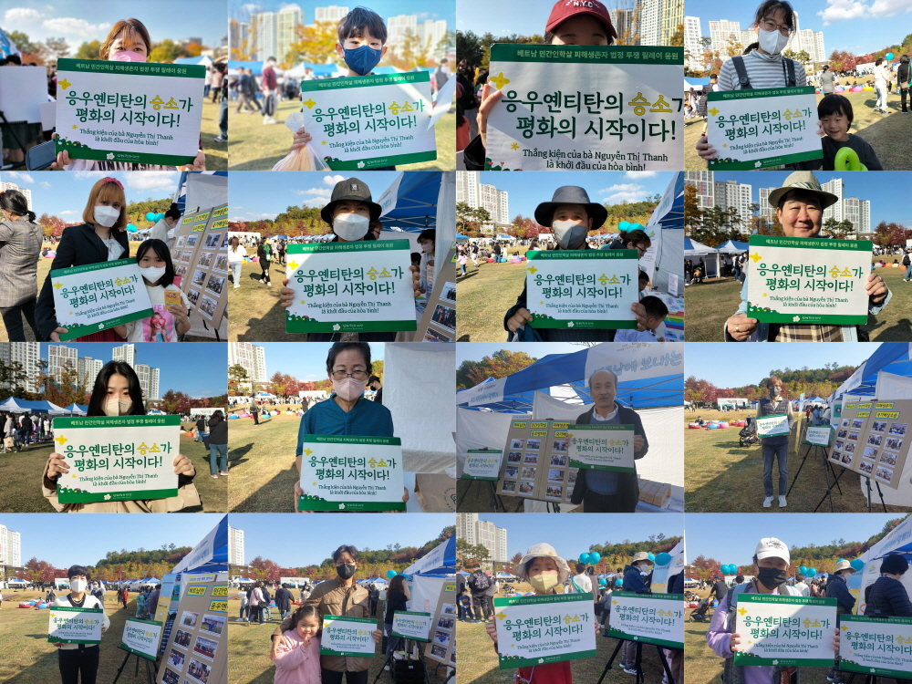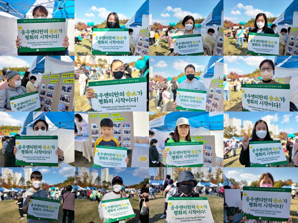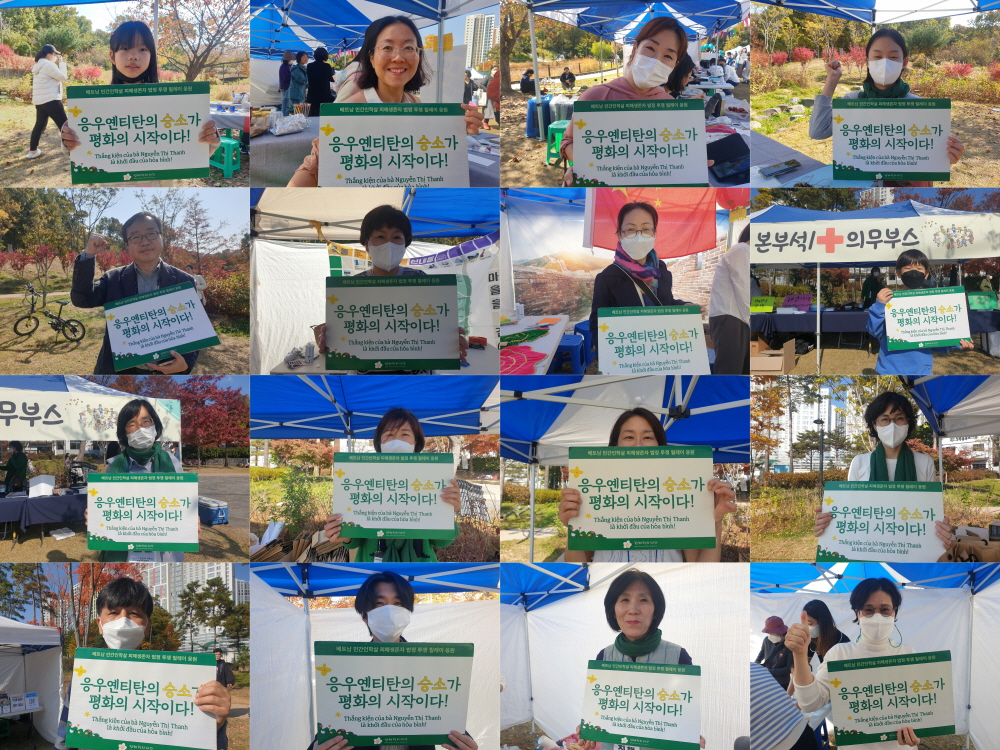 “베트남전쟁 피해생존자 응우옌티탄이 한국 정부를 상대로 재판을 하고 있습니다. 승소를 기원하는 인증샷에 참여해주세요!”