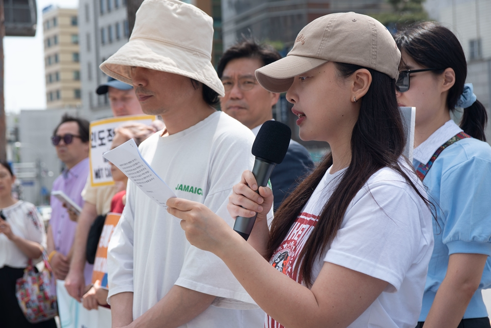 이날 기자회견문을 낭독한 정여름 감독(오른쪽)과 극단 <종이로 만든 배>의 진준엽 배우(왼쪽)