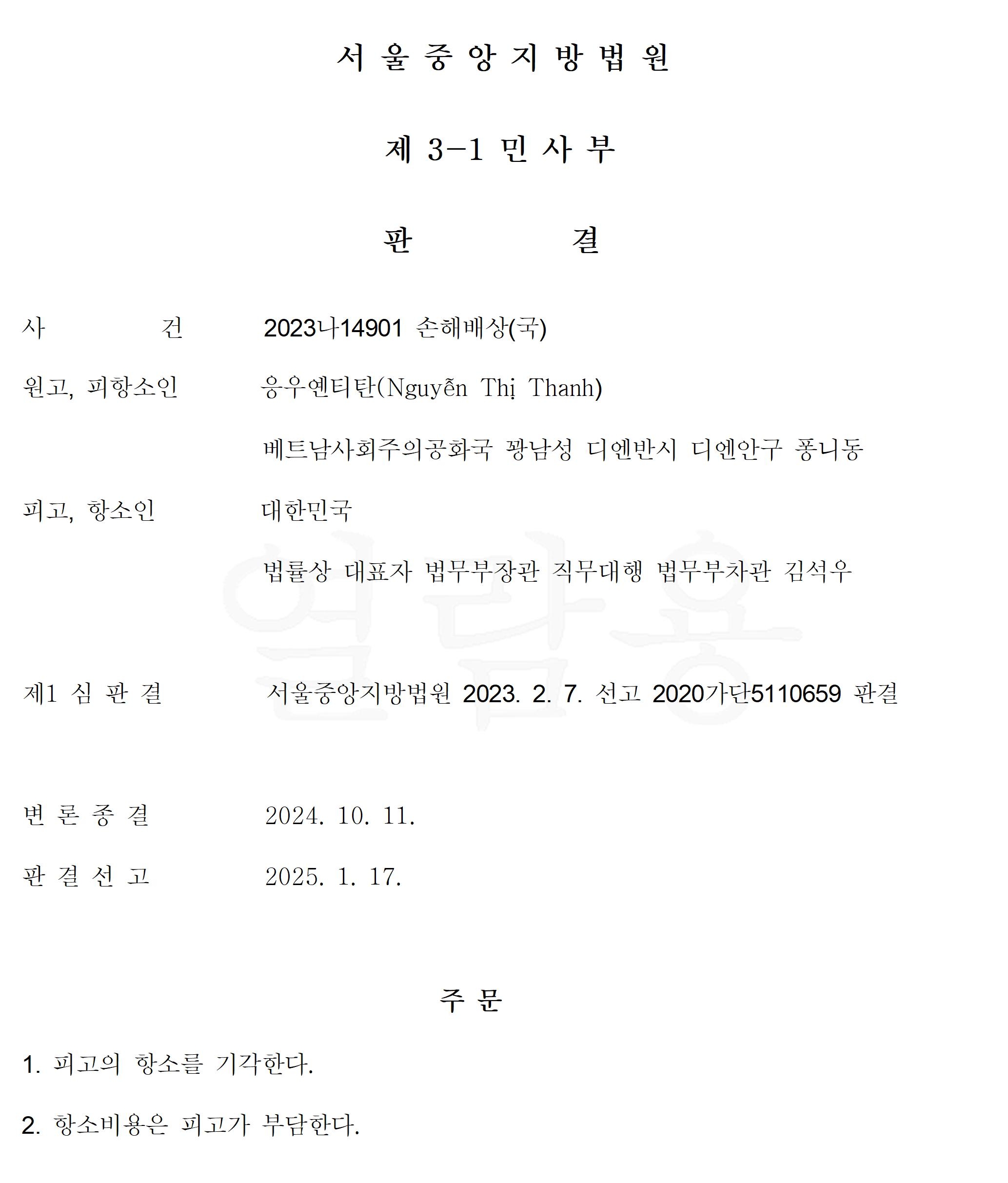 “피고(대한민국)가 이와 같이 위 OOO에게 허위내용의 진술서를 징구하여 이 법원에 증거로 제출하며 위 인터뷰 기사내용이 왜곡된 것이라고 주장한 행위 또한 이 사건 공격(퐁니·퐁녓 마을 학살)의 진상을 의도적으로 은폐하는 행위이자 소송상의 신의를 어기고 원고의 피고에 대한 배상청구구건 행사에 장애를 초래·강화한 행위로 보아야 한다.”