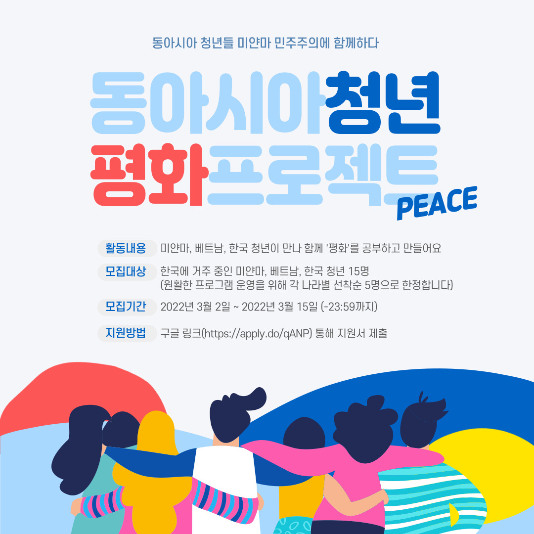 2022년 봄, 미얀마의 봄을 기다리며 미얀마, 베트남, 한국 세 나라의 청년이 모여 민주주의와 인권을 공부하고 평화를 나누는 프로젝트를 시작합니다. 작지만 시끄럽고, 재미있고, 평화롭고, 새롭게 목소리를 만드는 15인의 동아시아 청년 평화 프로젝트. 7주에 걸쳐 진행될 이번 여정에 함께 할 분들을 모집(3월 15일 마감)합니다.