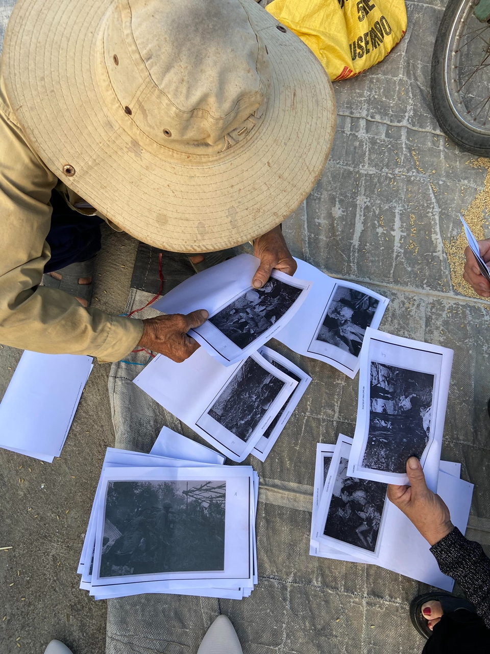 본 상병이 찍은 20장의 사진을 보며 피해 장소에 대한 이야기를 나누는 증언자들