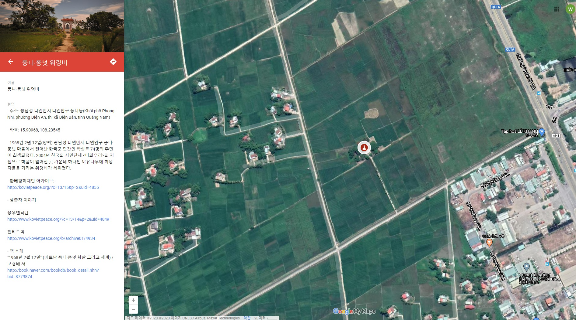 재단이 제작하여 공개한 꽝남대학살 위령비 구글지도 속 퐁니퐁넛학살 위령비와 마을의 모습