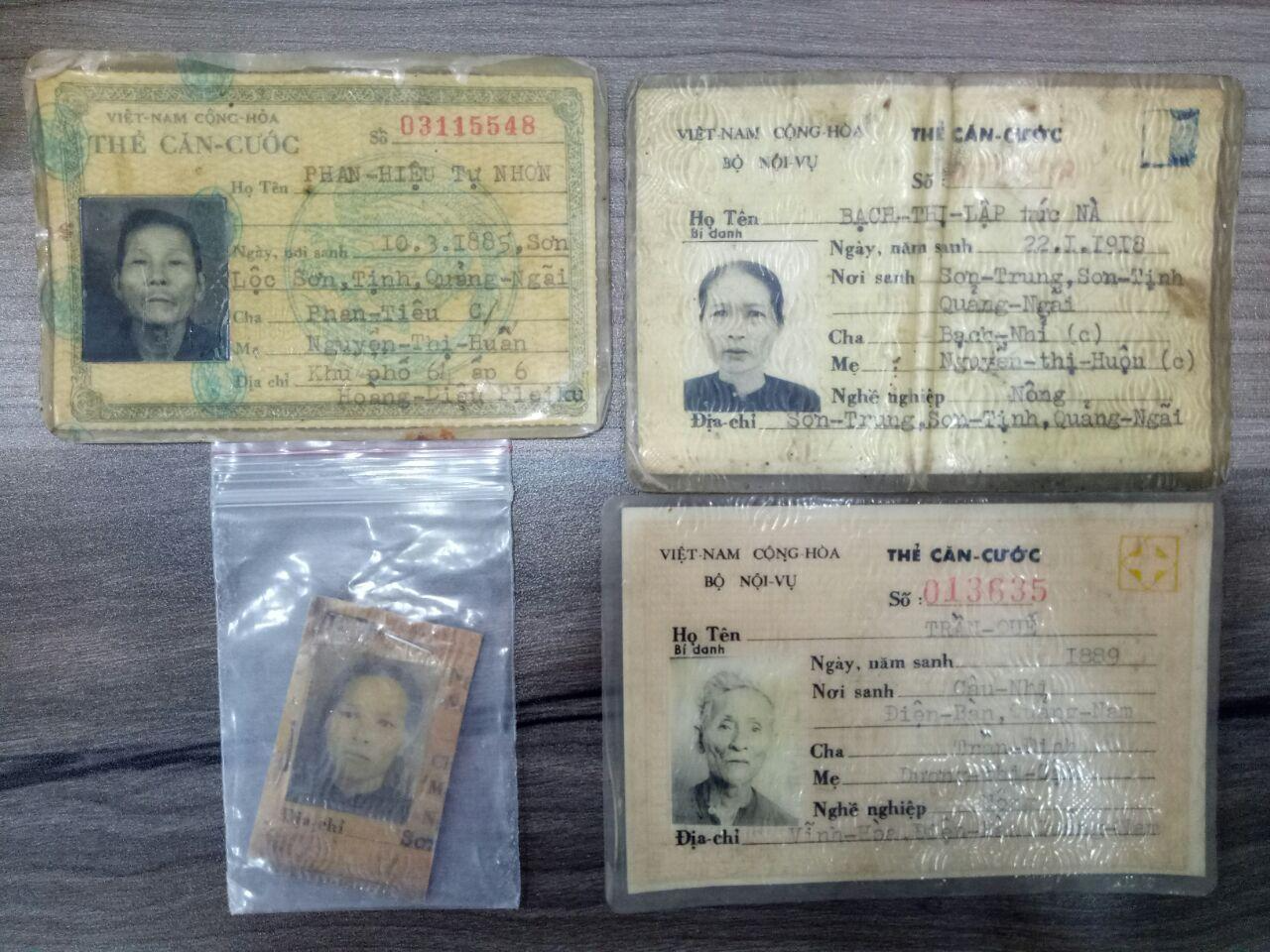 유가족들이 기증한 네 개의 신분증. (왼쪽 위부터 시계방향) 지엔니엔학살 피해자 판히에우, 하떠이학살 피해자 박티럽,