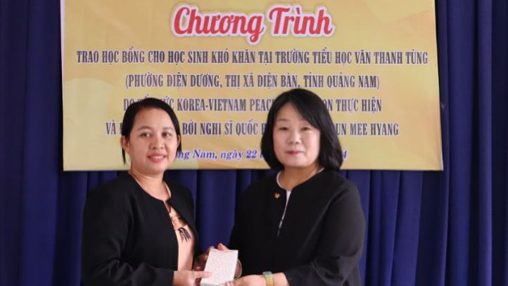 이번 장학금은 하미 마을에 위치한 반탄뚱 초등학교 90명(학살 피해자 자녀 15명, 생계곤란 75명), 하꽝 마을에 위치한 호반비엔 초등학교 90명(학살 피해자 자녀 15명, 생계곤란 75명)에게 전달되었습니다. 22일(월) 오전, 반탄뚱 초등학교에서 열린 장학금 수여식에서 윤미향 의원은 “여기 이 자리에 함께 하고 있는 학생 여러분이 베트남의 미래입니다.”라며 인사를 건넸고 학생 한 명 한 명에게 평화의 메시지를 전하며 장학금을 전달해주셨습니다.