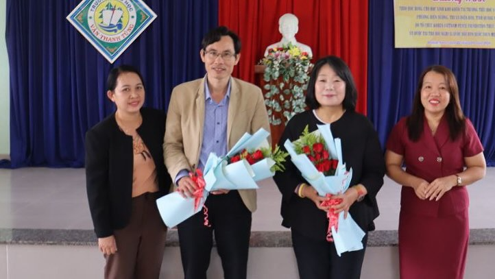 (오른쪽부터) 반탄뚱 초등학교 교장 지엡 선생님, 윤미향 의원, 꽝남성 우호친선단체연합회 부주석 쩐반하이