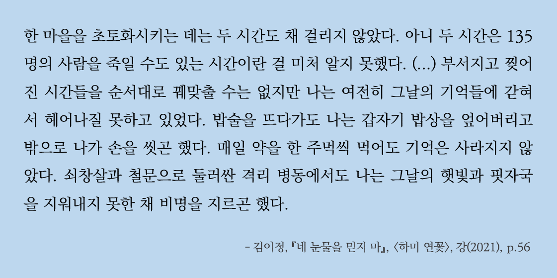 글을 쓸 때는 무척 힘들었죠. 묘사가 굉장히 적나라하잖아요. 지금까지 이렇게 사실 묘사와 재현에 가까운 방식으로 소설을 쓴 적이 없어요. 진저리나게 끔찍하고 쓰기 싫은 장면들도 물론 있었죠. 그럴 때에는 더 오랜 시간이 필요했어요. 감정적으로 거리감이 좀 생기면 그제야 글을 썼고요. 어렵게 소설을 완성하긴 했는데, 끝내고 나니까 더 읽기 싫더라고요. 사실 다른 작품은 종종 다시 읽곤 하는데, <하미 연꽃>과 <퐁니>는 손이 잘 안가요. 증언과 몇 가지 자료에 기반을 두고 상상력을 더해 소설을 썼어요. 그러니 처음부터 끝까지 모든 내용이 ‘사실’이라 할 순 없어요. 그렇게 읽는 사람들을 경계하기도 하고요. 그럼에도 진실을 알리려 애쓰긴 했어요.